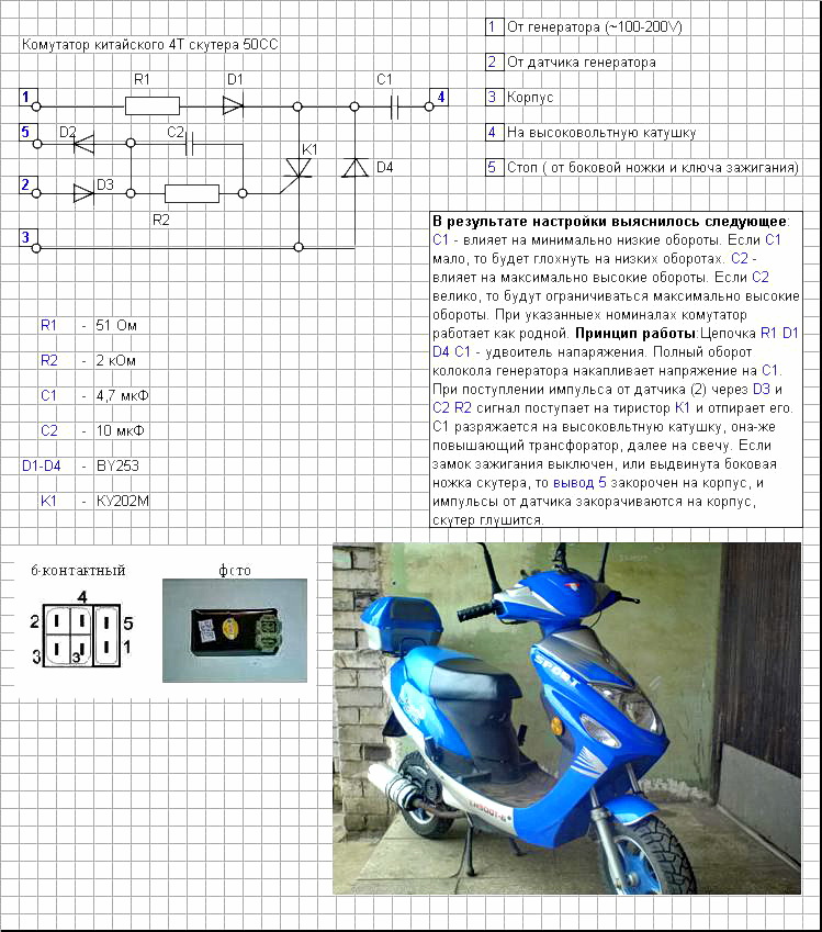 Не путайте камутаторы между собой , на Хонда дио аф 34 , если не ошибаюсь , стоит так называемый камутатор ( DC-CDI ) т .е . он питается постоянным током от бортсети скутера . А на схеме что выложил Slaviks изоброжён камутатор (CDI) он питается переменным напряжением от отдельной катушки генератора . Между собой они не взаимозаменяемы . Хотя внешне и похожи . Проще заменить камутатор на заведомо исправный и от 34-рки Чем расковыривать пластик