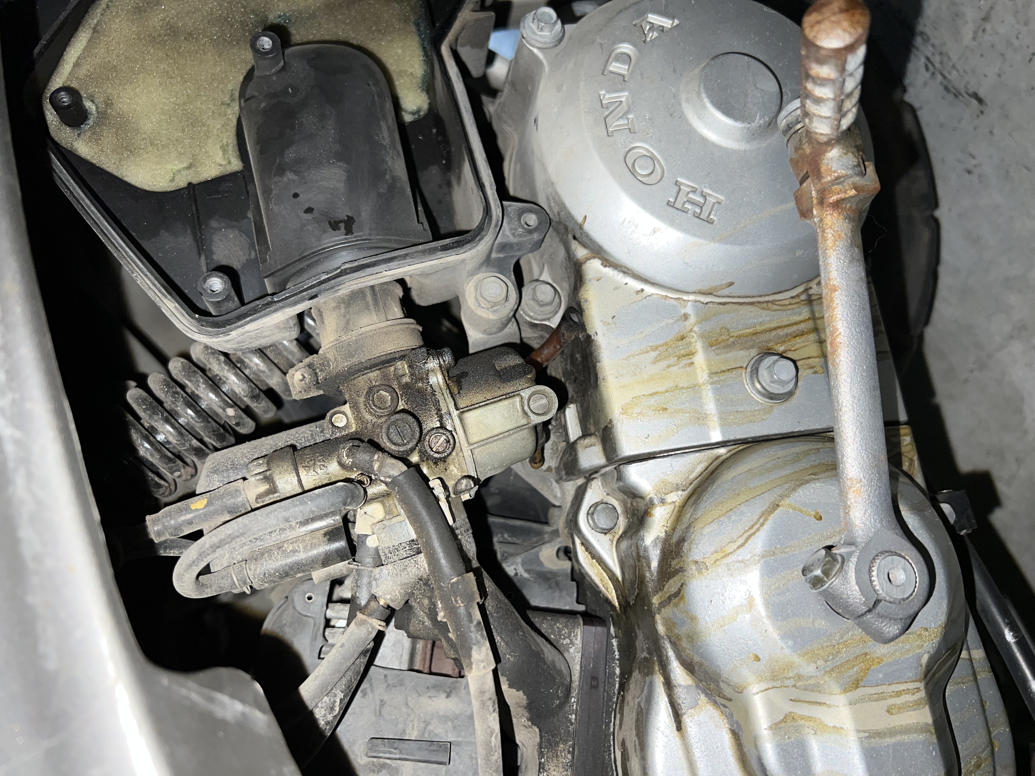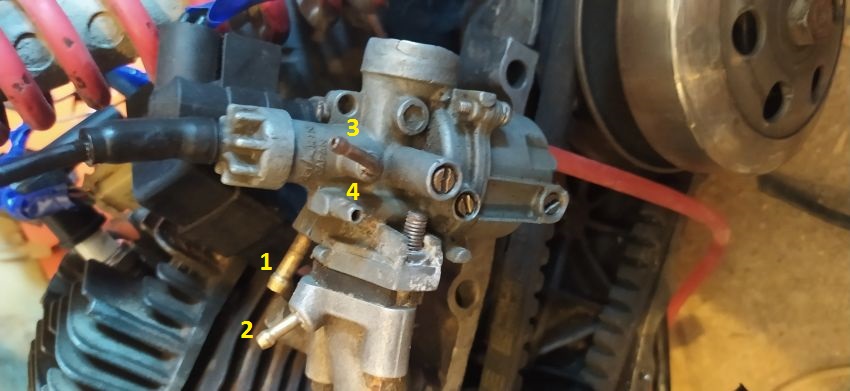 Фото с хорошим разрешением. Все бы так делали. Сразу скажу, что так ездить нельзя. Если масло идёт наружу, то внутрь обязательно идёт воздух, с пылью. Которая очень быстро убивает сначала кольца и цилиндр, а потом и всё остальное. С трубок вроде не бежит, скорее, соединения или прокладки не держат. Лужа над киком, возможно, с карбюратора, а может, и с движка (выдавило прокладку под цилиндром) или с лепесткового клапана. Под подозрением также соединение карбюратора с резиновым патрубком возд. фильтра (где железный хомут). Возможна трещина в этом патрубке. Я бы вытер подозрительные места насухо, завёл мотор, и посмотрел внимательно, с фонариком, откуда конкретно идёт масло. Если оно не идёт, погазовать. (Если, конечно, скутер стоит на центральной подставке, и заднее колесо висит.) И на всякий случай задубевшие концы трубок отрезал бы(обычно 1-1,5 см), и заново надел. Если их длины на это хватит. На фото: 1- Подача бензина; 2- К вакуумному бензокрану; 3- Подача масла; 4-выход в атмосферу из поплавковой камеры; 5-Сливной (дренажный) патрубок. Рядом его запирающий винт. (Для ремонта-диагностики). 6 - Похоже, сливная (дренажная трубка), снятая зачем-то с патрубка (5), другим концом надета на головку болта, чтобы не потерялась. Но, может, тут я ошибаюсь, у меня другой карб.)