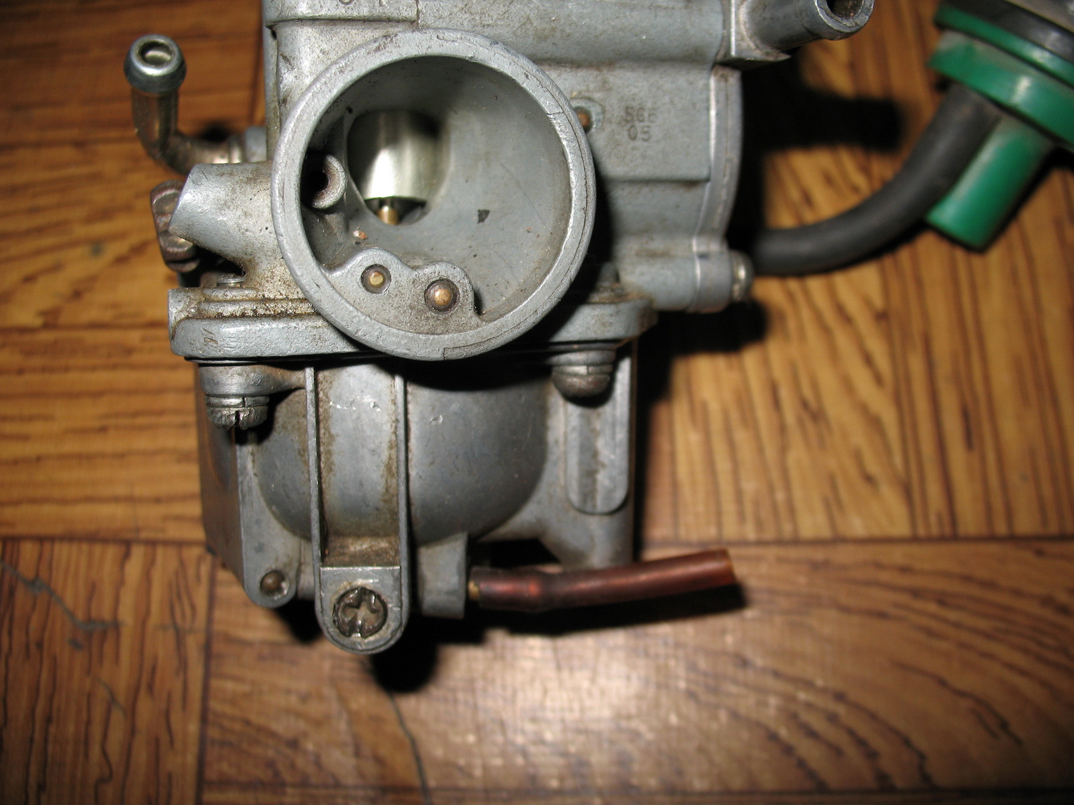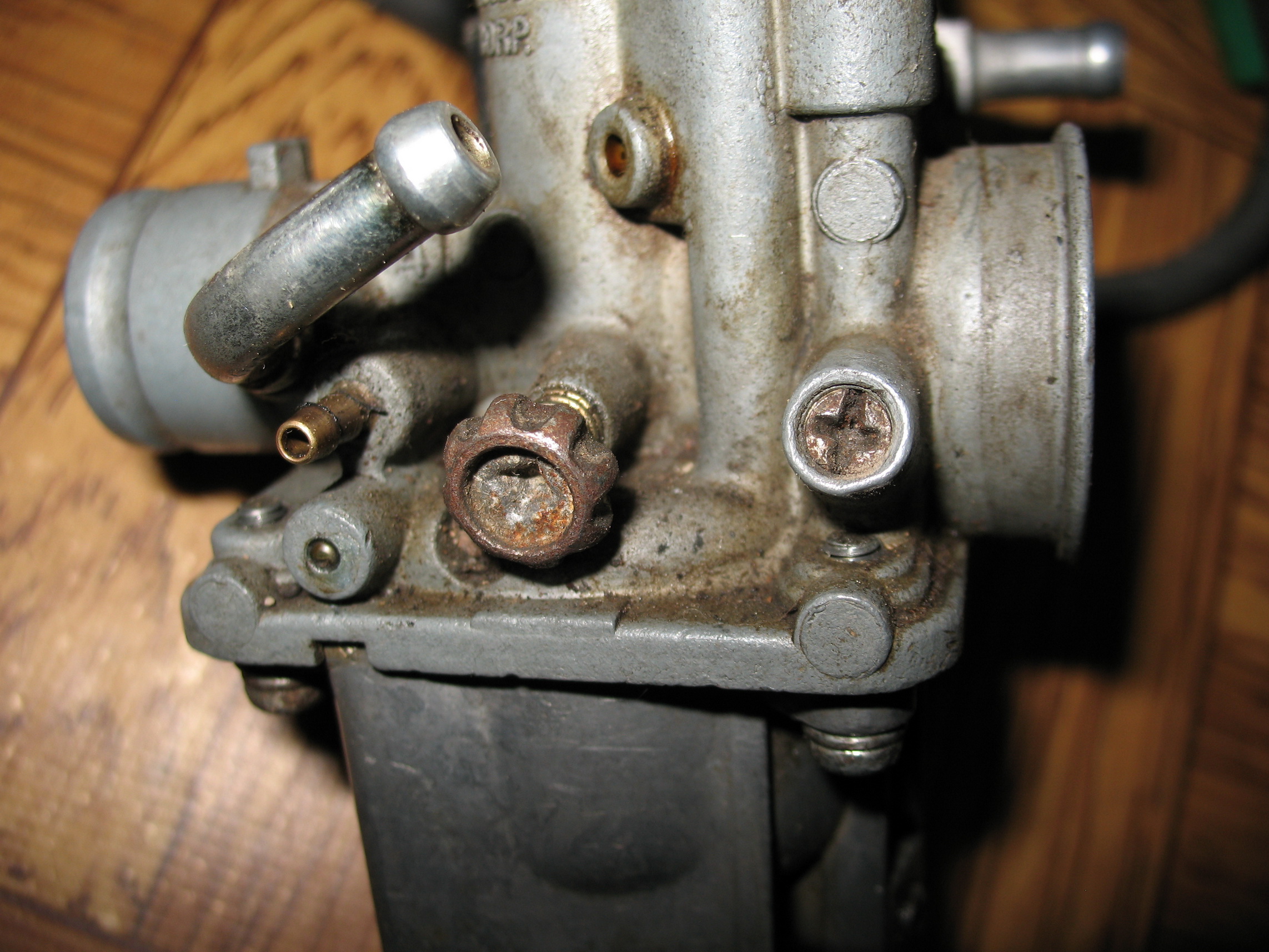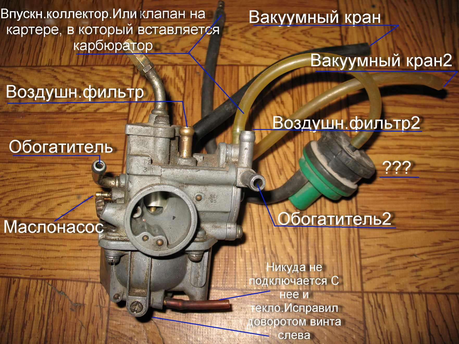Пробовал завести... Где то на 5й попытке схватил и тут же заглох. После продолжительных и неудачных повторений заметил подтеки на карбюраторе, а так же текло из трубочки. Снял, подтянул болты, докрутил винт (регулировочный) (хотя что он регулирует, не понимаю (расположен возле трубочки))