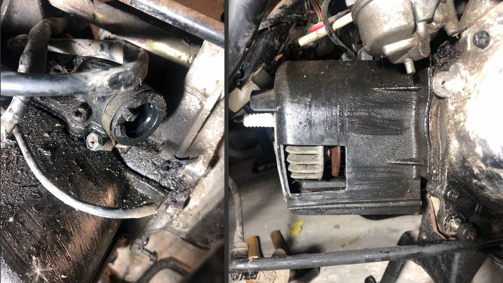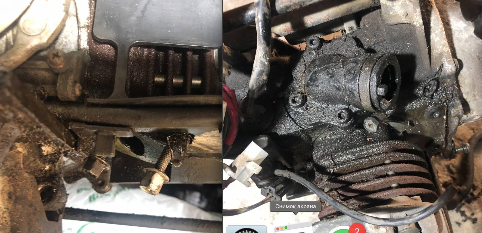 с правой стороны.в кожухе фильтра воздушного было не много смеси (бензин/масло)