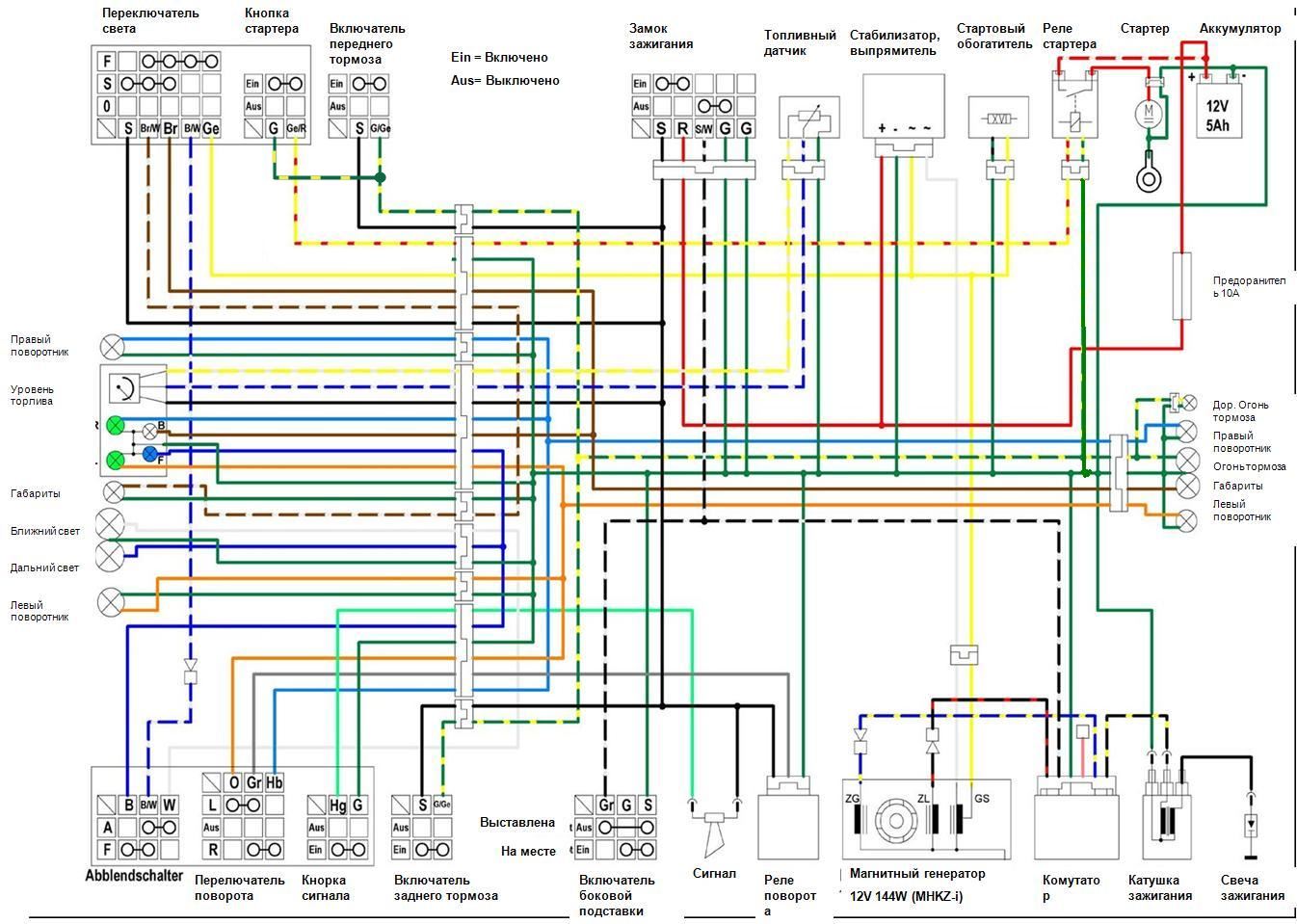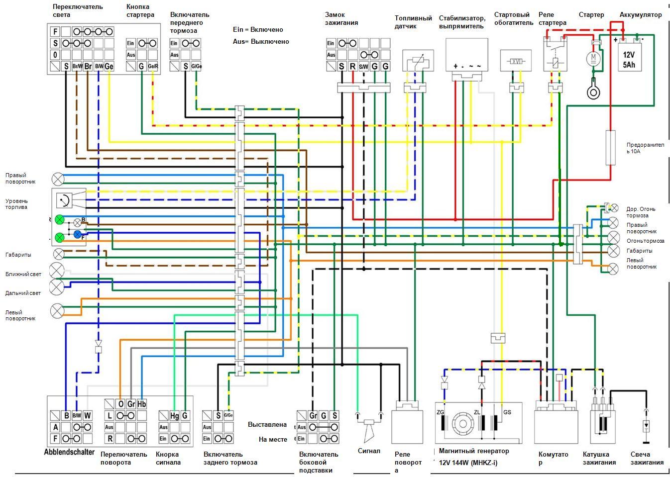 Плюсовая клемма АКБ соединяется с замком зажигания (красный провод). При включении зажигания +12В от замка подается на черный провод. При нажатии на передний или задний тормоз, черный провод замыкается с зелено-желтым (который идет на реле стартера).