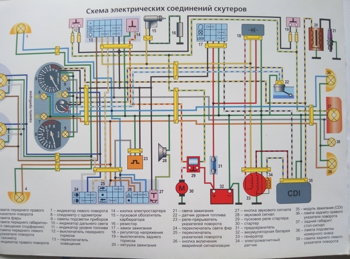 Доброго дня! Столкнулся с такой проблемой: при заведенном скутере выгорают лампы (лампа панели приборов, лампа фары). Еще по схеме от генератора выходит зеленый провод к регулятору напряжения у меня от генератора этого провода нет