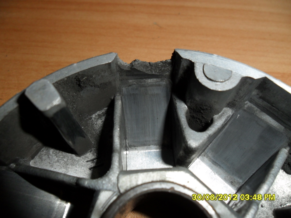 Использовать его нельзя. Лучше заменить на новый. Можно конечно распилить и остальные дорожки, а эту подровнять, получится своеобразный тюнинг варитора, ролики будут выкатываться дальше, отсюда может незначительно увеличиться скорость. Весь процесс тюнига вариатора с фотографиями я опишу в ближайшее время на основном сайте в статье. Следите за обновлениями. |