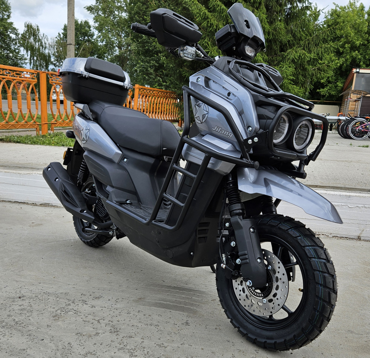 9. Шасси и размеры: 9.1. Тип рамы: трубчатая, сварная 9.2. Передняя подвеска: телескопическая вилка 9.3. Ход передней подвески, мм: 82 9.4. Задняя подвеска: рычажная, маятникового типа 9.5. Ход задней подвески, мм: 70 9.6. Передняя шина: 3.50-10 9.7. Задняя шина: 3.50-10 9.8. Передний тормоз: дисковый, гидравлический 9.9. Диаметр переднего тормоза, мм: 80 9.10. Задний тормоз: барабанный 9.11. Диаметр заднего тормоза, мм: 80
