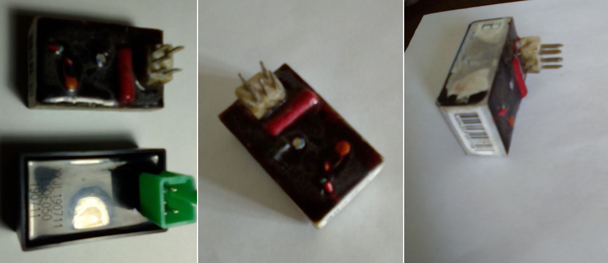 С чего начинается театр? "с вешалки" (С)Луначарский. А с чего начинается коммутатор:... С разъёма!!! О как! Блин, были фотки как делал... Хрен найду... Не помышлял ещё об опубличивании. На словах. Вырезал из обычной рыбной консервы прямой кусок. Зашкурил от пищевого защитного лака с обоих сторон. Накромсал полоски шириной, как родные копыта на стоковом коммуте. Сложил в двое каждую. Каплю паяльной кислоты +паяльник, +припой. Получились будущие PINы (копыта). И жёсткие, и лужение. Припаял к каждому по отрезку провода. Перекрыл торец снятого со штатного коммута разъём "мама" кусочком бумаги и проколол в разъём ответные PINы "папа". Всё прям на мопеде. Виток с небольшим не широким скотчем по разъёму, так чтоб в сторону огрызков проводов получился колодец. Развёл, совсем чуть-чуть эпоксидки. Выждал, пока смола стала гуще мёда, и немного заполнил колодец. На следующий день извлёк. За счёт высокой вязкости (густоты) смола ущерба разъёму мопеда не нанесла. Не хочет густая во все щели лезть. Далее подробно не буду. Опасный момент описал. Дальше пайка/эпитеты... Опять пайка/междометия... Внимательный осмотр, междометия/эпитеты... Устранение косяков и окончательная заливка в картонный, заранее приготовленный корпус...