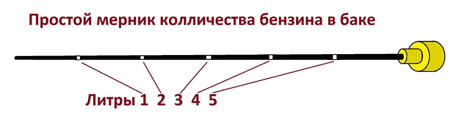 Для точного измерения я сделал се простейший мерник(фото). Сам хлыстик применил от спинингового удилища(черного цвета - лучше видно), а на конце пробка(у меня от водочной бутылки). Разметку наносил белым маркером, после залива в пустой бак очередного 1 литра бензина. Закрепить в кофре его можно , приклеив к его(кофра) стенке резиновой петельки, в которую и вставляю мерник.