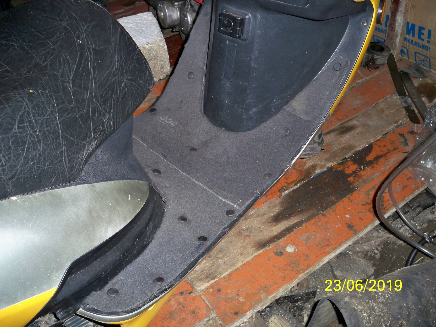 Всем доброго дня. Все кто имеет средние или большие скутера, обязательно получат такую неприятность, как усыхание коврика под ногами и отрыв крепежных мест на этих ковриках. Кто-то их пытается как-то закрепить, а я просто выбросил. Заменил его старым половым покрытием, с начало вырезал выкройку из бумаги, а потом по выкройке, коврик, получилось очень даже прилично, линолеум класть не советую он очень скользкий. Но дело не в коврике, а в его крепеже. Я купил в авто магазине, наши отечественные разъемные клипсы, стоимость копейки. Если их перед установкой не подготовить, то потом, при разборке например , чтоб добраться до аккумулятора у них отрывается грибок. Предлагаю край у грибка немного срезать, чтоб легко под него заходила отвертка, а саму ножку грибка, перед установкой немного смазать литолом или любой густой смазкой. Вот и всё может кому пригодится.