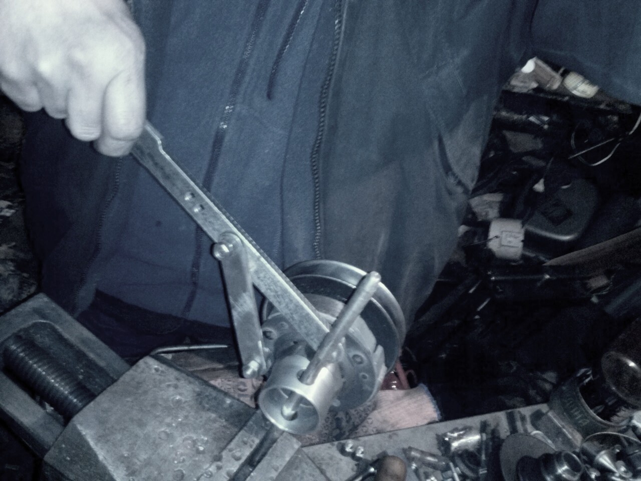 Хочу презентовать оригинальный съемник колоколола для двига 139 QMB, идею подкинул Викторович, несколько лет таким пользуется, теперь такой есть и у меня. Конструкция его проста, на фото хорошо видно его конструктив и составляющие, До не давней поры пользовался обыкновенным, «классическим» вариантом и нареканий не было, но попался твердый орешек, не по зубам простому съемнику, и пришлось вооружаться более серьезным инструментом…. Коротко о его работе: ударная часть крепится к обыкновенному съемнику посредством резьбы, сначала устанавливается съемник, делается натяжка болтом потом прикручивается ударная часть, делаем несколько коротких ударов (скользящим грузом, ударником), откручиваем ударную часть, добавляем натяжку на болте и повторяем ту же процедуру с ударами…, у меня после третьей подтяжки колокол сошел вот и все. Для тех кто не знает – резьбы на колоколах бывают левые и правые, и обе М24 Х 1.