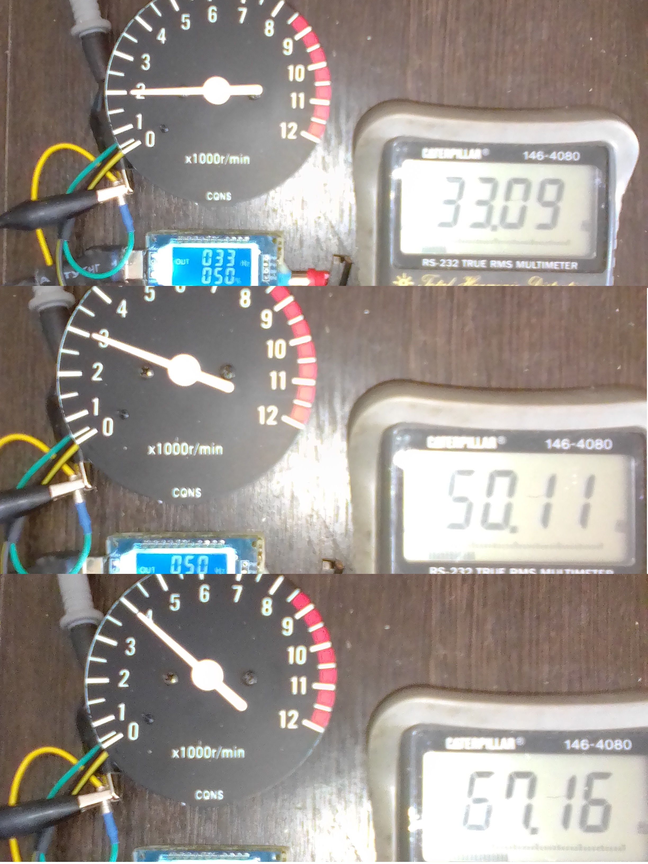 На гене: скважность 50% частота 50Hz с гены, это 3'000 RPM на тахе, соответственно 100Hz, это 6'000 RPM, а 150Hz - 9'000 RPM на тахе. На фотках (мой пост выше) видно и гену и частотометр (мультик).